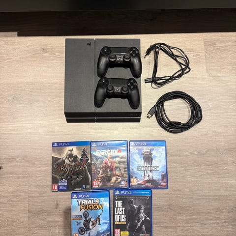 Sony Playstation 4 spillkonsoll i svart farge. Inkluderer en kontroller og nødvendige kabler. Konsollen har flere porter for tilkobling av eksternt utstyr. Passer til spilling av ulike PS4-spill. Har kjøpt spill som fc 24,25 og 26. har gta5 og andre spill som du kan se på det siste bildet