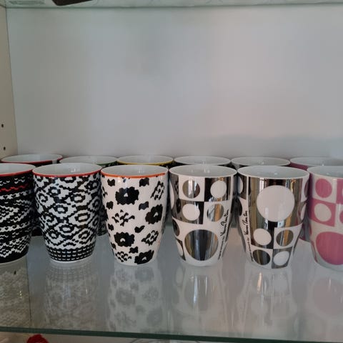 Designet har et karakteristisk svart, abstrakt mønster på hvit bakgrunn.