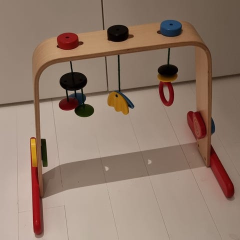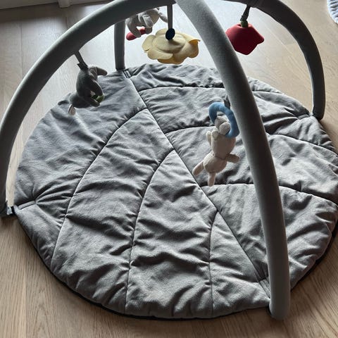 IKEA Lekfull babygym med myk, grå matte og hengende leker i forskjellige former og farger. Babygymen er designet for små barn og stimulerer lek og motorisk utvikling.