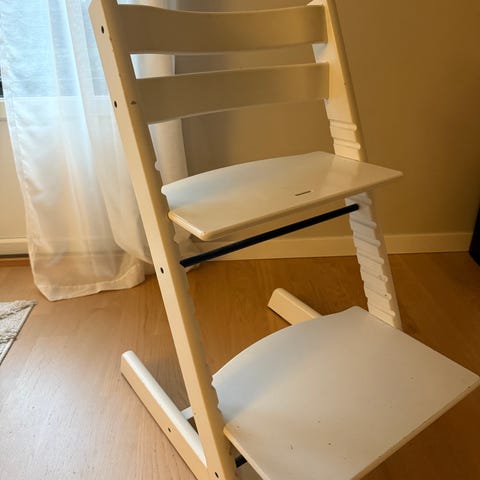Godt brukt tripp trapp stol med bøyle. Eldre type stol. Slitt maling.