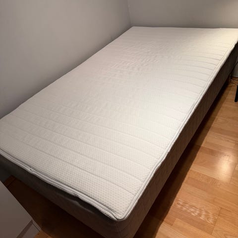 Rammemadrass fra IKEA i modellen Skårer. Jeg kjøpte den på Finn selv, men må selge den direkte videre da den ikke hadde plass der jeg ønsket. Den er i god stand, og de få flekkene det er på den kommer fra flytting/frakt og bør kunne fjernes med møbelrens hvis behov. Madrassen selges som den er.