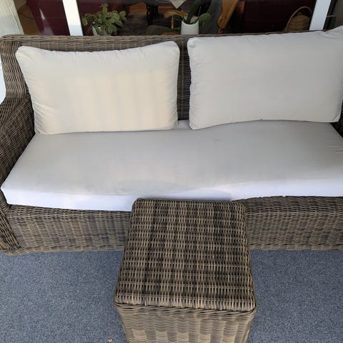 Utemøbelsett bestående av en sofa, en stol og et bord i svart kunstrotting. Settet inkluderer lyse puter til sofa og stoler.