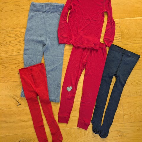 Noen av de blå buksene har noen små hull her og der, se bilder. Kan sikkert fikses.