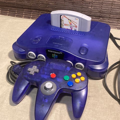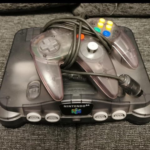 Selger en komplett Nintendo 64 i eske. Esken har slitasje og skavanker som man ser på bilder, så dette er ikke et super pent eksemplar, men isoporen er hel og maskinen er fungerende og pen. Kontrolleren sin stikke er litt løs, men ikke kjempeløs. Alt virker som det skal. Selges som den er på bilder :)