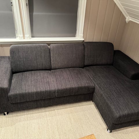 120 cm sovesofa fra jysk. Madrass brettes ut og legges til gulv. Mørk grå farge. Overmadrass brukt 2 ganger følger med i prisen.