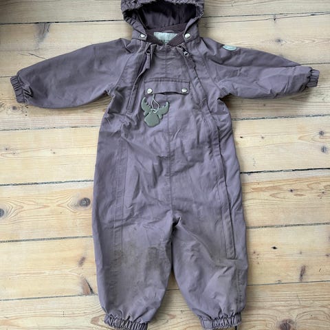 Superfin parkdress i størrelse 86 fra Wheat. Brukt av to jenter så litt slitasje, spesielt i rompa. To forskjellige fotstrikk.