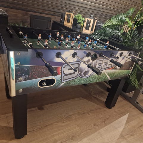 Ikke åpnet. Tabletop Foosball bordspill i kompakt størrelse. Spillet har håndtak for kontroll av spillere og en spilleflate med fotballtema. Passer til bordspill og innendørs bruk.