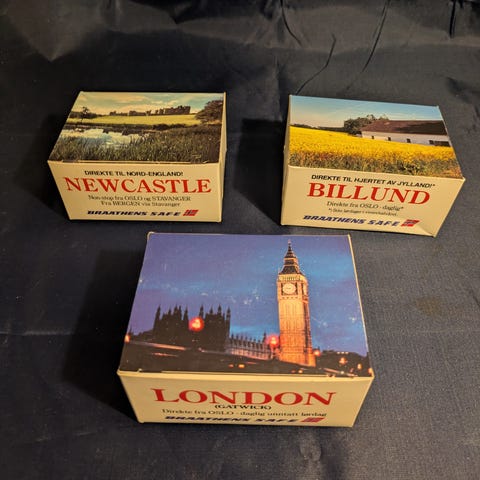 Hver ekse har reklame for en Braathens SAFE rute (Billund, Newcastle, Murmansk og London)