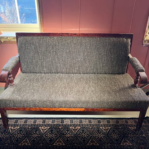 Stabil konstruksjon og godt bevart helhetsinntrykk. Noe normal bruksslitasje i stoffet, som gir sofaen autentisk patina (se bilder). Perfekt som blikkfang i stue, gang, soverom eller i klassisk interiør.