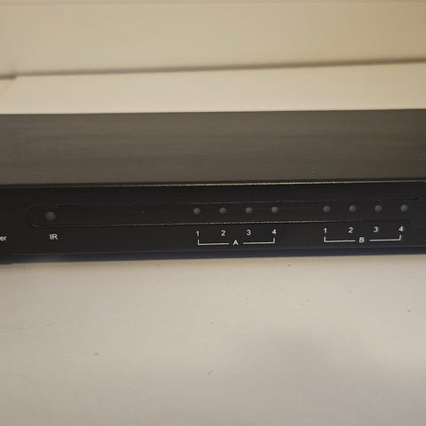 HDMI-switch med 4 porter. Enheten har fire HDMI-innganger og en HDMI-utgang, designet for å koble flere HDMI-kilder til en skjerm eller TV.