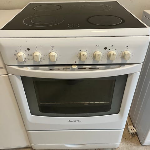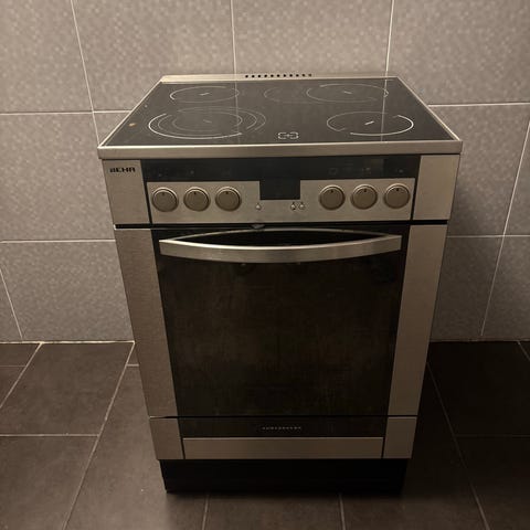 Electrolux keramisk komfyr med keramisk kokeplate. Komfyren har flere betjeningsknapper for justering av varme og funksjoner. Ovnsrommet har rist og dør med glass. Egnet for matlaging og steking.