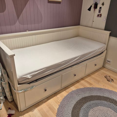 Praktisk uttrekksseng fra IKEA. Noe slitasje, men fungerer fint. Praktisk med god oppbevaring i skuffene. Kan følge med en madrass, men noe merker.