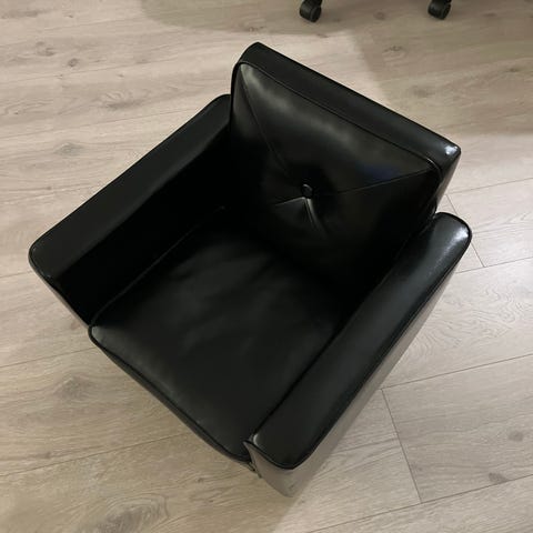 Bohus lenestol til barn laget i svart kunstlær. Lenestolen har en polstret rygg og armlener, samt fotstøtte.