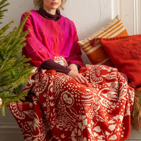 Nyydelig vevd blomsterpledd med lun, vinterlig følelse — perfekt til sofa, seng eller som dekorativt overkast.