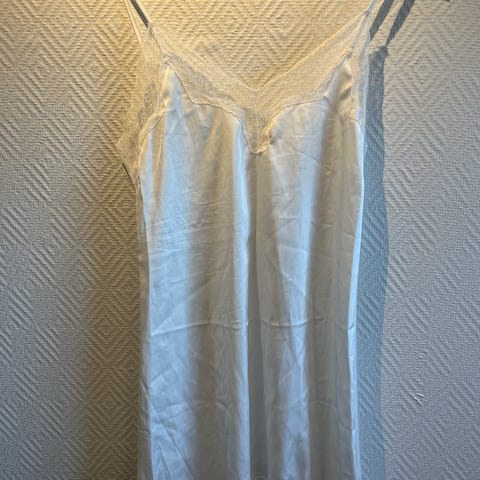 Selger denne fine nattkjolen/slip-in dressen. Kjøpt hos H&M og er strl XS. Selges da den ikke har blitt brukt så mye som den bør. En kort nattkjole i sateng med V-hals, blonde øverst og supersmale, regulerbare skulderbånd. Håper du kan gi denne et nytt og bedre liv!