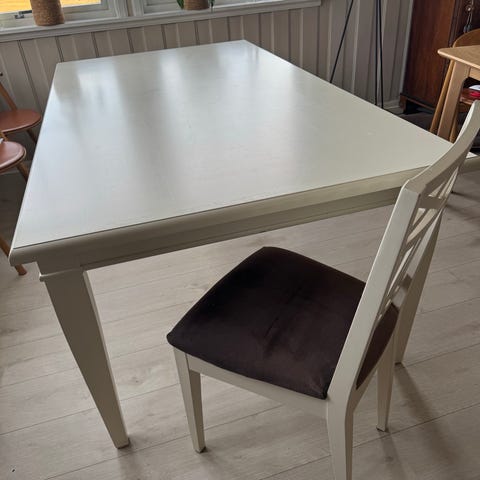 Brukt spisebord i heltre selges med 6 stoler. Stoler og deler av bord er malt hvite. Stolene er trekt om en gang.