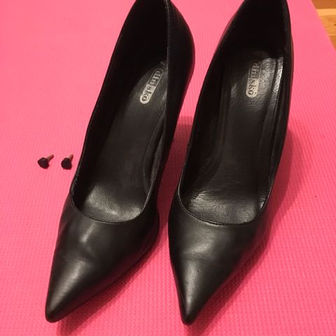 Svært lite brukte pensko. Høy hæl, åpen tå. Reim rundt ankel med gull spenne. Skinn innvendig og utvendig.