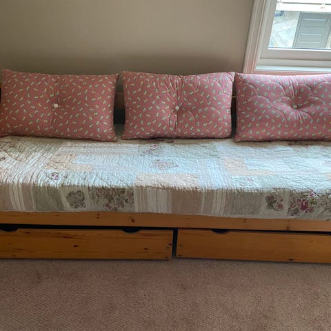 Bremnes dagpeng med 2 skuffer og 2 madrasser. 1 lamell mangler og 1 er reparert