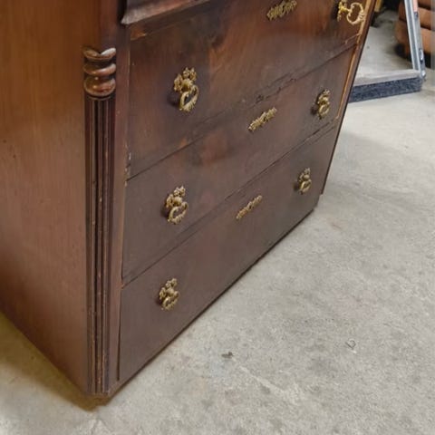 Selger en rar, gammel kommode som jeg har hatt en globus oppå og noen skrivesaker inni.