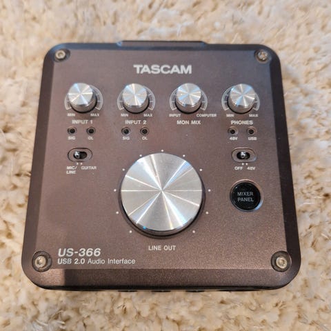 Tascam US-200 USB lydgrensesnitt med to innganger for mikrofon eller instrument, flere lydutganger og MIDI-tilkoblinger. Enheten er designet for opptak og lydbehandling, og kobles til via USB. Bra, men eldre kort dette så sjekk opp drivere mot din maskin.