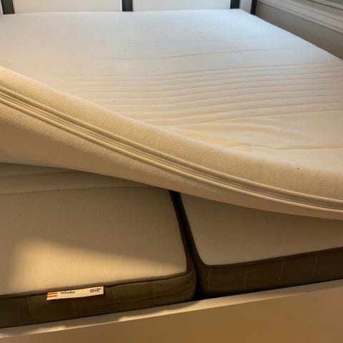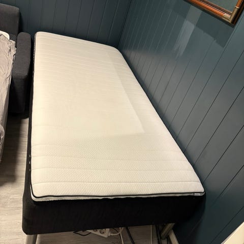 Skotterud IKEA-rammemadrass på 90cm bredde med Tuddal-overmadrass og Luddros beskyttelse til salgs pga flytting.