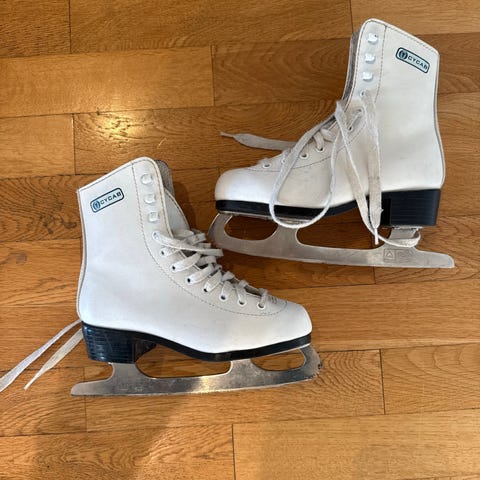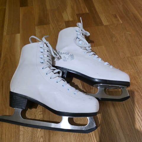 Hvite barneskøyter i størrelse 30. Passer for barn og er laget med fokus på komfort og støtte under bruk.