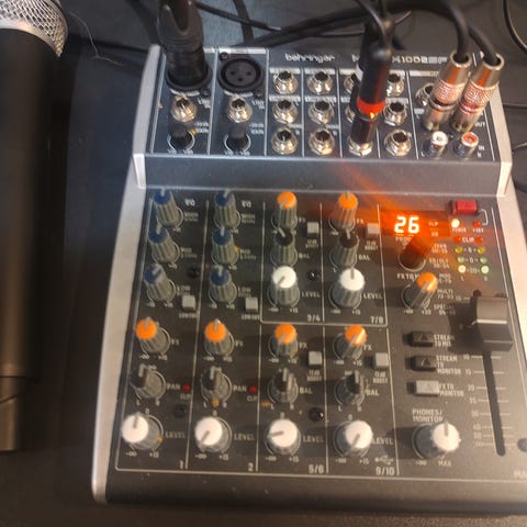 Behringer Xenyx 802 mikser med flere kanaler, innebygde lydkontroller og tilkoblinger for ulike lydkilder. Passer til lydmiksering i små til mellomstore lydoppsett.