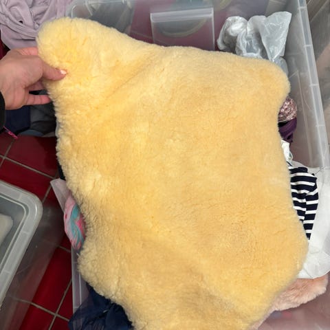 Pent brukt lammeskinn til barnevogn med hull til 5- punkt sele