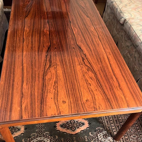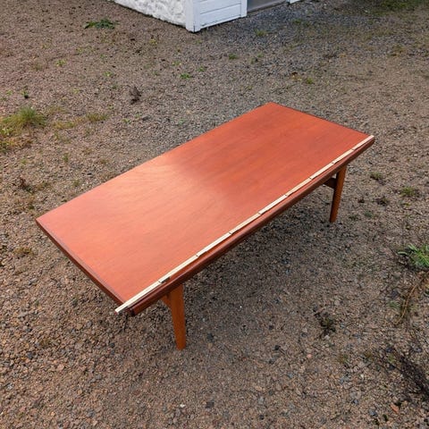 Retro sofabord i tre med en ekstra hylle under bordplaten. Bordet har et enkelt og funksjonelt design, egnet for stue eller oppholdsrom. Overflaten viser noe bruksslitasje.