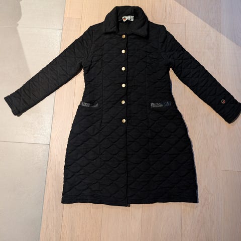 Busnel strikket kåpe i ull, brun farge, størrelse XL for dame. Plagget har dobbelspent knappelukking med dekorative knapper og lommer foran. Materialet er ull, som gir varme og komfort.