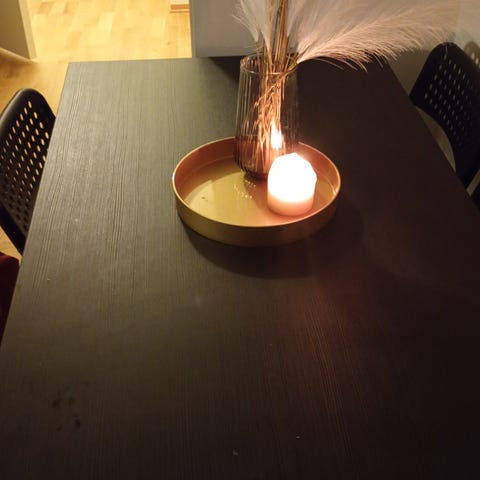 Bordet har to innleggsplater på 40-50 cm hver som gjør bordet bredere hvis ønskelig. Platene er hvite.