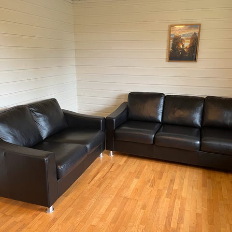 Lite brukt Hjellegjerde sofagruppe, lys grå skinn. 1 stk 3 seter og 2 stk 2 setere. Samlet pris for sofagruppe kr. 10.000,-