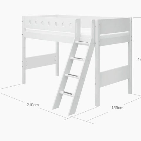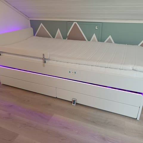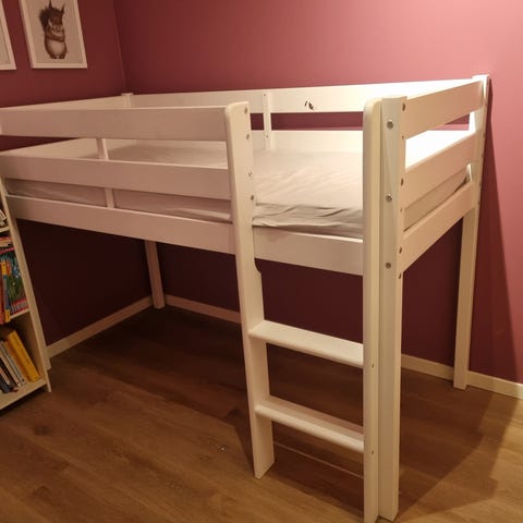 Hvit loftseng (90x200)med skrivebord og annen god oppbevaring (med lyse blå dører). God utnyttelse av plassen. Madrass er ikke inkludert.