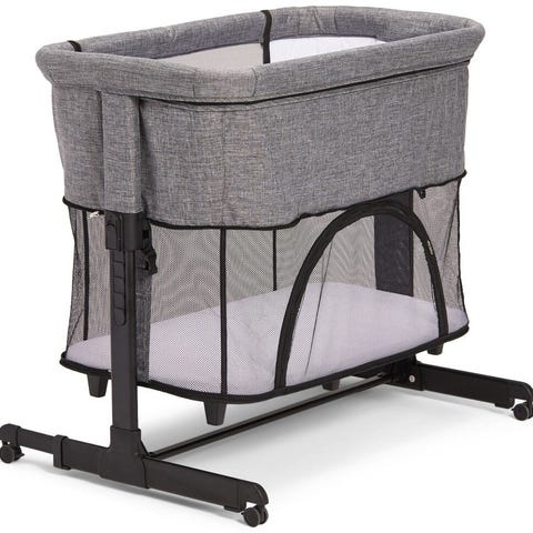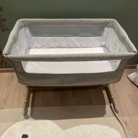 JLY Future Bedside Crib med netting, i fargene natur og hvit. Laget for å plasseres ved siden av voksen seng for enkel tilgang til barnet. Laget av materialer som gir god luftgjennomstrømning og komfort.