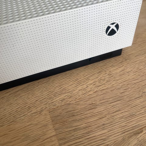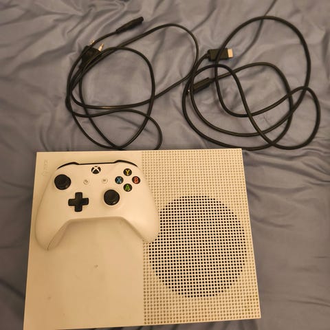 Microsoft Xbox One konsoll i hvit farge. Inkluderer én trådløs Xbox-kontroller og tilkoblingskabel. Konsollen har ventilasjonsåpninger og flere porter for tilkobling av eksternt utstyr.