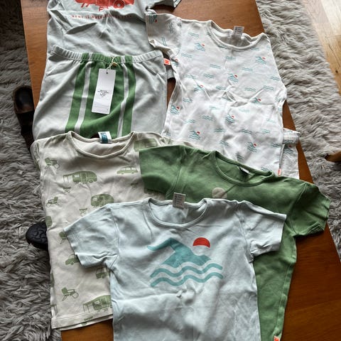H&M T-skjorter for gutt i størrelse 104. Laget av bomull. Fargene inkluderer hvit og stripet brun/hvit. Passer til barn i denne størrelsen.