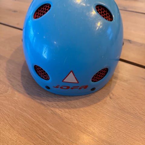 Lite og pent brukt hjelm til barn. Til skibakken eller på isen. Kan justeres med et "hjul" på baksiden. Fôret inni som også dekker ørene.