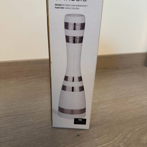 Den stilrene Omaggio-perlemorslysestaken passer på vakkert vis inn i det skandinaviske hjem, hvor de dempede perlemorsstripenes elegante glasur reflekterer skjæret fra kronelysets flamme. Håndmalte striper.