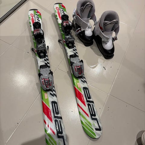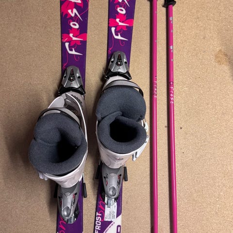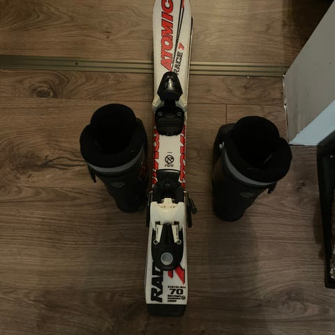 Noe bruksmerker på ski, støvler og hjelm, men i god stand.
