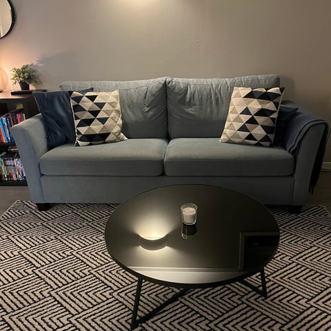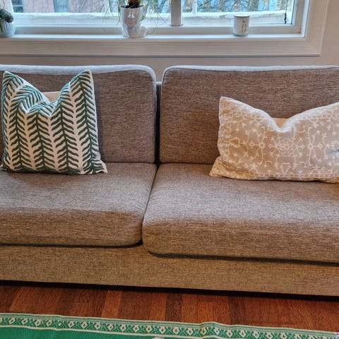 Sofaen kan demonteres og deles i to deler. Mulig det må gjøres for å frakte den.