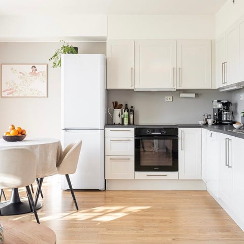 Frittstående komfyr og kjøleskap medfølger ikke, men kan kjøpes i tillegg for hhv. kr 1250 og kr 500.