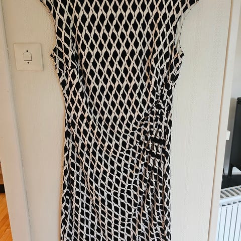 Mørk blå kjole fra Ralph Lauren. Det første bildene viser fargen. Myk blonder overdel. Den har et knytebelte i livet som vist på det første bildet, men jeg satte på ei sølvfarget spenne for å gjøre litt mer av det, og følger med. Kjolen er behagelig å ha på og faller pent, men viste seg å være litt for lang i ryggen for meg slik at den ble aldri brukt. Størrelse 16 (42), ca 101 cm lang, skulder va 40, under erme ca 47 og livvidde ca 40 (målt fra forsiden). Laget av polyester materiale.
