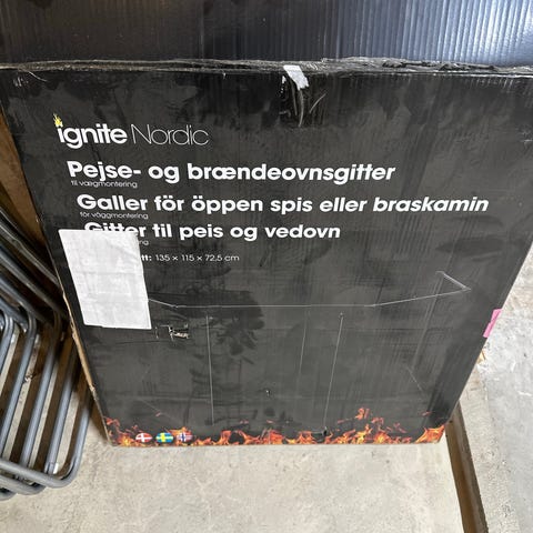 Peisgitter med målene 110x110x60 cm i svart farge. Laget av metall, designet for å sikre området rundt peisen.