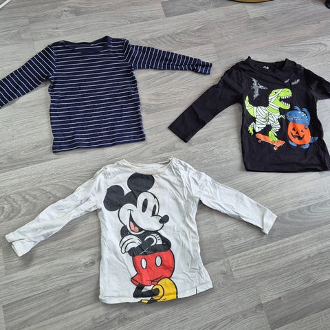 H&M barneklær for gutt i størrelse 98. Pakken inneholder tre t-skjorter i flerfarget design med ulike motiver, inkludert Mickey Mouse. Materiale ikke spesifisert.