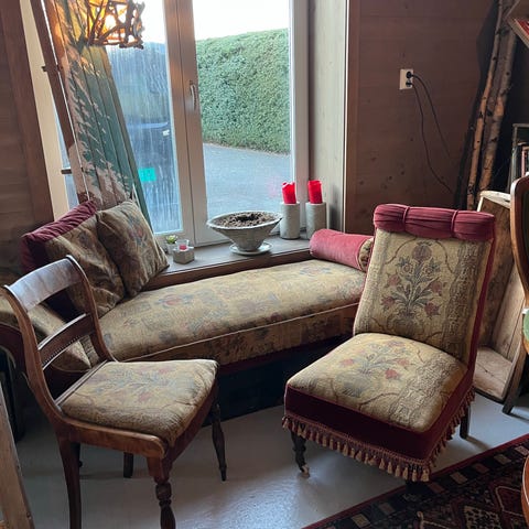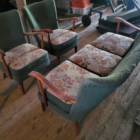 Nydelig rottingsalong bestående av sofa, to stoler og bord. Har tilhørt mine oldeforeldre og har blitt godt ivaretatt gjennom mange år.