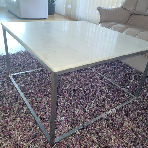 Lite brukt salongbord 140 x 80 cm høyde 53 cm og 2 stk lampebord i marmorin med stilig bøk understell. Lampebordene har rett side 70 cm. "Radius" 45 cm. Høyde 50 cm.