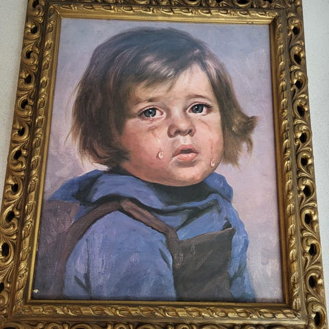 To litt eldre trykk av sigøynerbarn kalt Elena og Chiko, etter originaler av den amerikanske kunstneren Anne Allaban Farrell. Rammer i tre med gulldekor - noe slitasje og avskallinger på begge - og glass foran motivet. Bildene inkl. rammene måler 27 x 31,5 cm, motivene måler 16 x 21,5 cm. Ganske dekorative 🤩