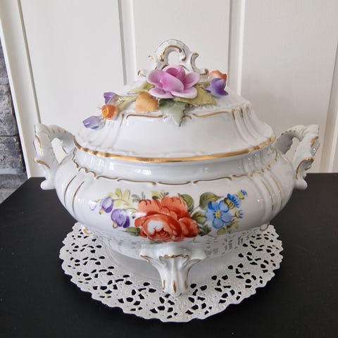 Design : detaljerte, pålagte porselensroser og blomster på lokket og håndtakene.
