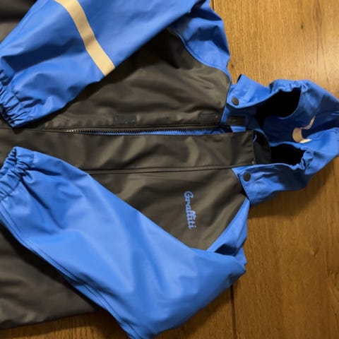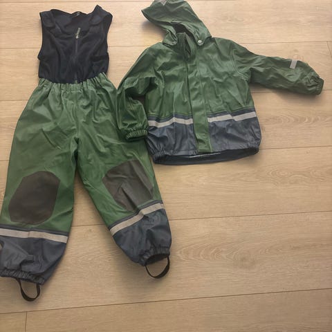 regnjakke,2regnbukser, en med seler og en med strikk midje, og regnvotter