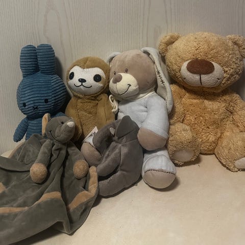 Selger pent brukte babyleker og bamser.